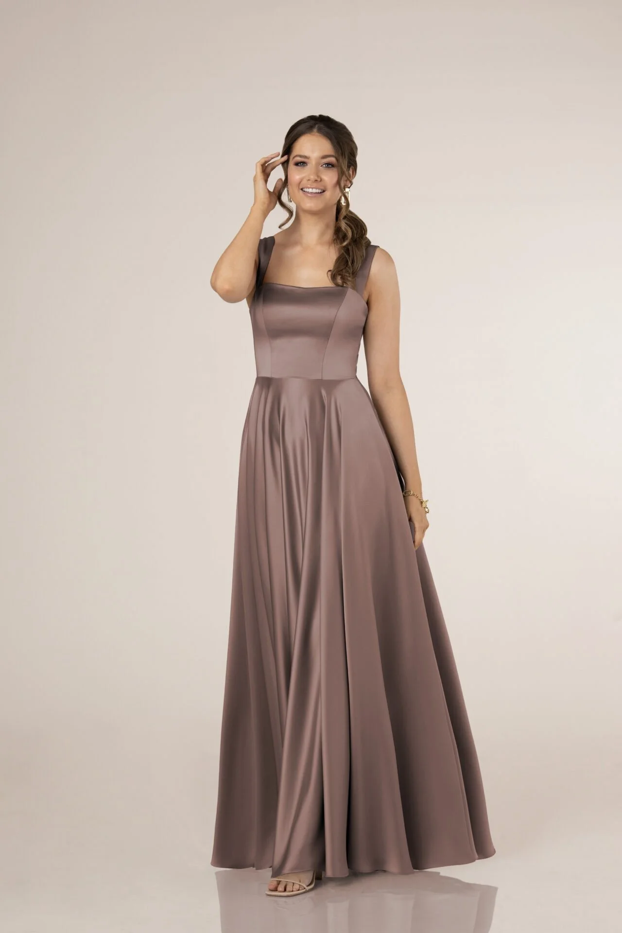 This Sorella Vita gown is a perfect example of understated elegance. The straight-across neckline and wide thick straps create a sleek, minimalist look that works beautifully across different body types.